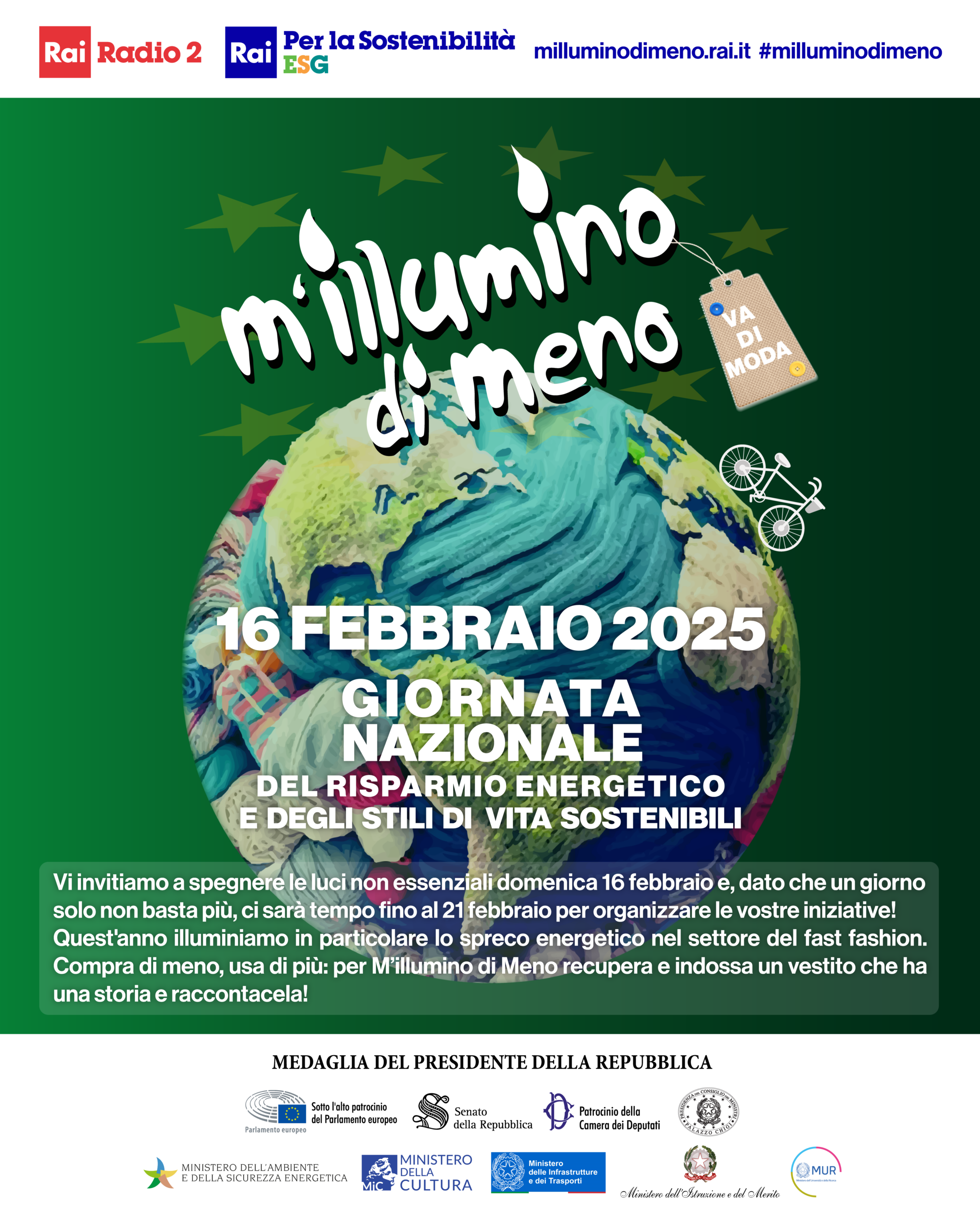 Per l’edizione 2025, l’iniziativa si allunga a un’intera settimana, perché un giorno solo non basta più per raccontarele migliaia di azioni messe in campo per il risparmio energetico e la transizione ecologica, rivolgendo un’attenzione particolare a un tema su cui, sempre di più, stanno maturando consapevolezza e voglia di sperimentare nuove pratiche di produzione e consumo: la moda.